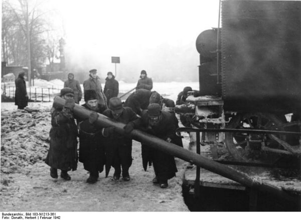 Трудоспособных евреев привлекали к принудительным работам. Заявки от предприятий поступали через биржи труда. Квалифицированных специалистов немцы учитывали отдельно, они работали по специальности. Остальных, включая женщин и детей, отправляли на тяжёлые вспомогательные работы — уборку мусора, чистку туалетов, погрузочно-разгрузочные работы, рытьё ям и тому подобное[69][89]. Особыми приказами запрещалось использовать евреев в сфере обслуживания, торговли или на канцелярской работе, в служебных помещениях, воинских частях и в качестве прислуги[90].