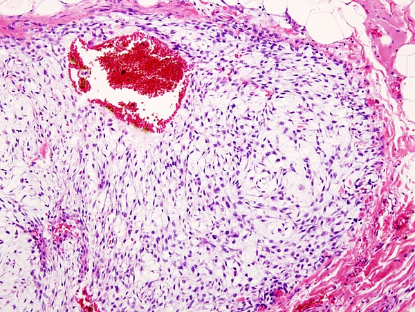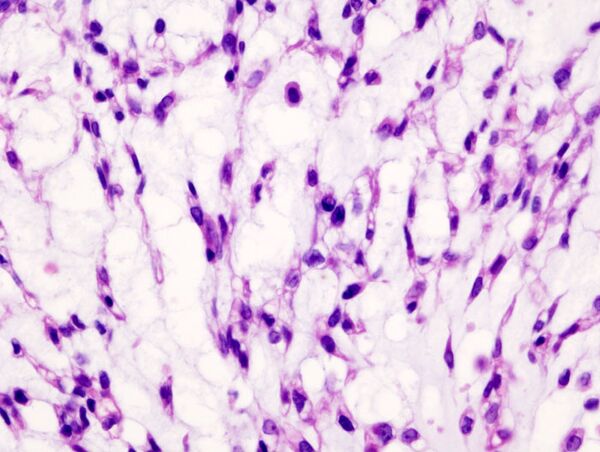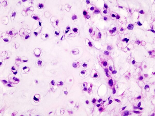 Хондросаркома — злокачественная опухоль хрящевого строения. Хондросаркома периферической локализации хорошо выявляется в виде плотной опухоли, прилегающей к кортикальному слою кости, иногда прорастающей в кость на различную глубину. В ней могут быть очаги оссификации и петрификаты. Опухоль плотноэластической консистенции, при наличии ослизнения, распада или кровоизлияний — более мягкая, не имеет ясного ограничения от соседней ткани. При разрезе нетрудно определить хрящевой её характер. При микроскопическом исследовании опухоль напоминает иногда хондрому, состоит из незрелых клеток с резко выраженным клеточным атипизмом. Часто рисунок опухоли имеет вид микросаркомы, в которой можно найти участки хрящевой ткани с плохо оформленными ячейками, содержащие неправильной формы хондробласты.