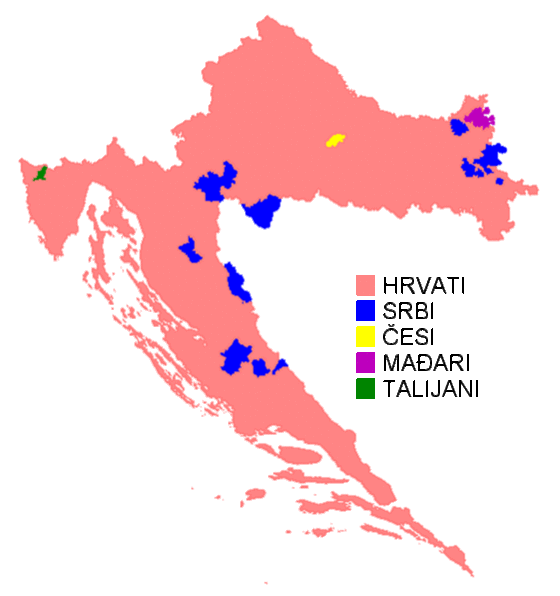 Действующая Конституция Хорватии определяет Республику Хорватия «как национальное государство хорватского народа и как государство представителей национальных меньшинств: сербов, боснийцев, словенцев, чехов, словаков, итальянцев, венгров, евреев, немцев, австрийцев, украинцев, русинов, болгар, рома, румын, турок, влахов, албанцев и других, которые являются её гражданами»[46]. Правовой статус 22 перечисленных в Конституции этнических групп регулируется Конституционным Законом о правах национальных меньшинств в Республике Хорватия[47], вступившим в силу в 2002 году.