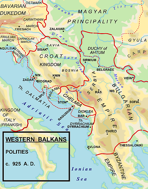 Во второй половине X века, хорватские земли находились под властью Степана Држислава. Он заключил союз с Восточной Римской империей, которая в свою очередь, признала его королём всех его земель[4]. После смерти Степана в 997 году, его сын Светослав Суронья продолжил про-византийскую политику. Его братья Крешимир III и Гоислав были против его правления и устроили попытку государственного переворота, прося болгарского царя Самуила о помощи. Отвечая на их призыв, Самуил начал нападение в 998 и разрушил далматские города Трогир и Сплит, но был остановлен во время осады города Задар. Болгарские силы вернулись на родину через Боснию[5]. Территории захваченные Самуилом во время войны были отданы Крешимиру и Гоиславу, которые, с дальнейшей поддержкой Болгарии, победили в хорватской гражданской войне и взяли на себя правление в 1000 году. Светослав был отправлен в ссылку в Венецию, но после смены правительства в Венеции он был сослан в Венгрию, где вскоре и умер. После смерти Ивана Владислава в 1018 году Болгария попала под византийское владычество, а Крешимир III и Гоислав, стали византийскими вассалами.