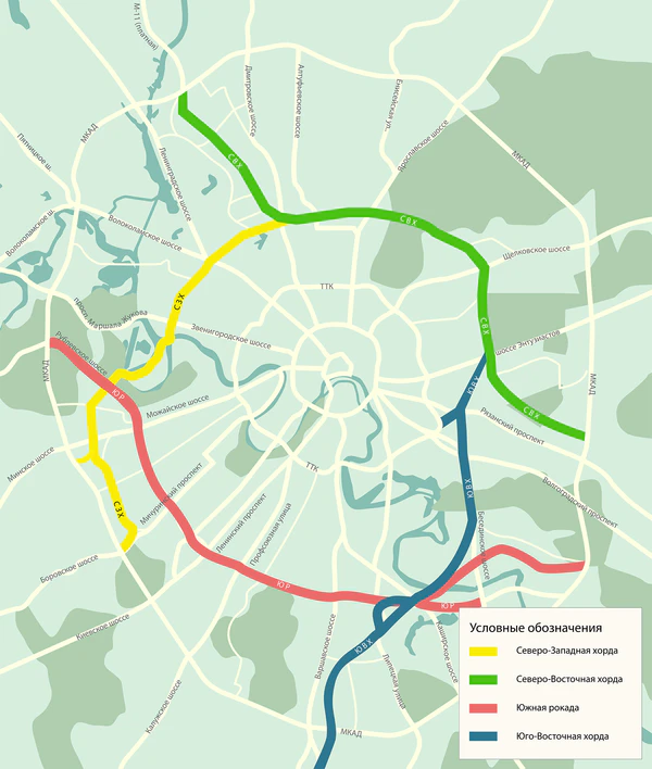 «Хордовое кольцо» Москвы представляет собой строящуюся кольцевую магистраль между Третьим транспортным кольцом (ТТК) и Московской кольцевой автомобильной дорогой (МКАД), сформированную из четырёх отдельных хорд и рокад: Северо-Восточной, Северо-Западной и Юго-Восточной хорд, а также Южной рокады. В настоящее время отдельные участки хордового кольца готовы, другие — находятся в фазе проектирования и активного строительства. Скоростной режим на построенных участках хордового кольца составляет 60 км/ч.