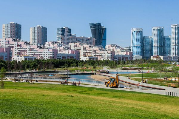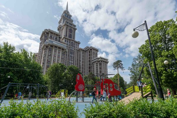 Парк на Ходынском поле разбили по просьбам жителей района[24]. На территории обустроили искусственные холмы со смотровыми площадками и пространствами для досуга, а также разместили пруд площадью 6291 квадратный метр[25]. В зеленой зоне высадили душистые растения – шалфей, мяту, черемуху, жасмин, липу и сирень. На центральной аллее парка, которая была обустроена на бывшей взлетной полосе аэродрома, установили сухой фонтан из 245 струй площадью 778 квадратных метров с водными эффектами и светомузыкой. Неподалёку от аллеи был установлен необычный арт-объект – зеркальный лабиринт со столбами разной высоты. В память о прошлом Ходынского поля в парке обустроили игровую площадку «Авиатор», выполненную в виде неба с радугой и облаками, где разместили большой игровой комплекс в виде самолета Ил-18. Для детей также была организована площадка для тренировки навыка паркура и двойная тарзанка. На одном из холмов парка были установлены круговые панорамные качели для детей и взрослых. В спортивной зоне парка построили воркаут-площадку, скейт-парк, баскетбольную, волейбольную площадку и теннисный корт, а также установили столы для игры в настольный теннис и сделали площадку для панна-футбола. Для бега и велопрогулок на территории проложили специальные дорожки. В северо-западной части парка поместили площадку для выгула собак со снарядами для дрессировки.