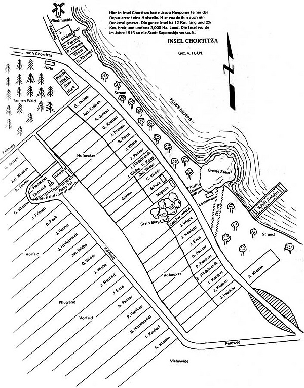 Сначала немцы хотели расселиться по всему острову, но это оказалось неудобно и опасно: на них нападали разбойники и поселенцы, жившие напротив острова, на левом берегу Днепра в Александровской крепости и вокруг. Последние совершали грабежи и убийства, поэтому немцы основали компактную колонию. К концу XIX века в колонии Хортица насчитывалось три тысячи жителей[23].