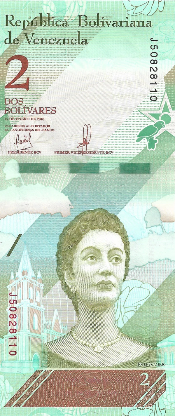 - Изображение Хосефы Камехо размещено на венесуэльской банкноте достоинством в 2 Боливара 2018 г.