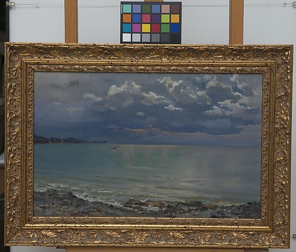 На полотне представлен морской пейзаж: на переднем плане изображена узкая полоса каменистого берега и прибойной полосы с низкими волнами, украшенными лёгкими гребешками. Основную часть занимает морская гладь зелёно-голубого оттенка, подчёркивающая спокойствие сцены. На заднем плане просматривается дальний берег бухты и сине-серые кучевые облака.
