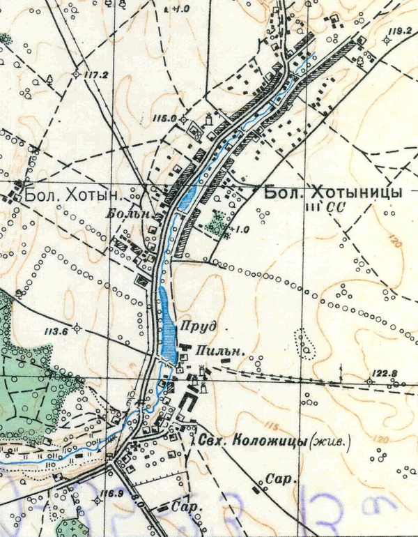 Согласно топографической карте 1930 года деревня называлась Хотыницы и насчитывала 121 двор, в деревне была школа, лечебница, пильная мельница, церковь и совхоз Каложицы[20].