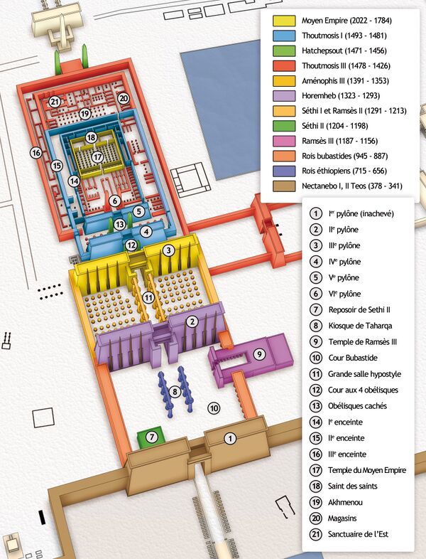 В Карнаке комплекс, посвящённый Амону-Ра, расположен в центре по отношению к двум другим священным комплексам, одному, посвящённому Монту (на севере), другому — Мут (на юге). Внутри корпуса, посвящённого Амону, десять пилонов большого храма были расположены вдоль двух осей: главной оси, идущей с запада на восток, с шестью пилонами, и вспомогательной оси, идущей с севера на юг, с четырьмя пилонами.