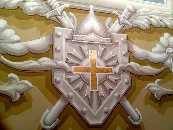 Фронтоны портиков украшены лепными изображениями Георгиевского креста с идущими от него лучами. Ранее на фризе портала в центре была надпись «Въ память побѣды надъ Татарами 1552».
