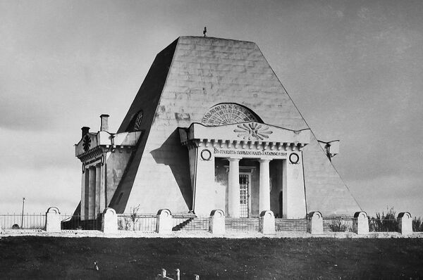 Алфёров, впечатлённый, будучи в Средиземноморье, архитектурой Древнего Египта и Древней Греции[1] (см. египтизирующий стиль, актуальный для господствовавшего тогда направления ампир), настоял на неординарной для православия пирамидальной форме храма-гробницы. Гравюра вида памятника была выполнена Козьмой Ческим[18].