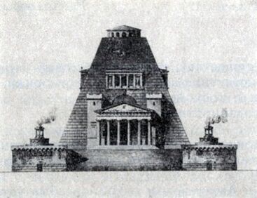 Памятник представляет собой поднятую на высокий постамент двадцатиметровую четырёхугольную усечённую пирамиду со всеми равными измерениями: длиной, шириной и высотой. С четырёх сторон — входы в здание, украшенные греческими портиками и двумя дорическими колоннами. В храм со стороны главного входа ведут 20 широких каменных ступеней, с других — по 12 ступеней.