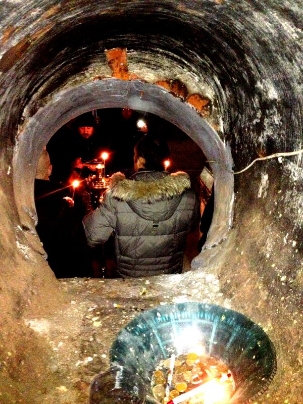 Под здание ведёт сводчатый подземный ход, по спирали обходящий храм. По сторонам гробницы, над украшениями в виде военной арматуры были надписи: «Больше сея любве никтоже имать, да кто душу свою положит за други своя» (Иоанн. 15, 13), «Возлюблении и прекраснии, неразлучни, благоленки в животе своем и в смерти своей не разлучишася; паче орлов легки, паче львов крепцы» (2 Цар. 1, 23)[1][3]:122.