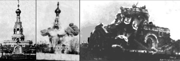 14 ноября (27 ноября) 1914 года в 8 часов 30 минут храм был взорван при большом скоплении народа. Деревянные фрагменты памятника были сожжены. На развалинах установили турецкие флаги. Процесс сноса запечатлел на киноплёнку офицер запаса Фуат Узкынай, ранее занимавшийся любительской киносъёмкой[3]. Фильм «Разрушение русского памятника в Сан-Стефано» стал первым в истории турецкого кинематографа[4][1].