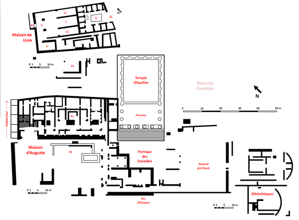 Неясно, был ли храм соединён с Домом Августа (подобно Александрийскому мусею, включённому в дворцовый комплекс Птолемеев). В портиках храма, как было принято в античности, располагалась двухсекционная (греческая и латинская) публичная библиотека. Светоний вскользь упоминал о декоративном убранстве библиотеки, утверждая, что полки в ней были вызолочены (Aug., 29). По-видимому, это должно было создавать торжественный настрой, приобщающий к божественной премудрости, и превращавший процесс чтения в священнодействие. О чрезвычайной роскоши убранства храма писал и Иосиф Флавий (Иудейская война, II, 6, 1)[4]. О библиотеке, помимо Светония, упоминал и Гораций в своих «Посланиях» (I, 3, 17), а также Овидий (Trist., III, 1, 60). Из схолиев к Ювеналу (I, 128) известно, что в библиотеке храма Аполлона Палатинского были собраны книги по гражданскому праву и свободным искусствам. Почти через полтора века фондами этой библиотеки пользовался Марк Аврелий[5]. В одной из надписей эпохи Адриана указывается, что попечитель-эпистат (др.-греч. ἐπιστάτης) Александрийского мусея одновременно был верховным жрецом Александрии и всего Египта, а также заведовал греческой и латинской библиотеками в Риме, то есть при храме Аполлона Палатинского, обустроенного по образцу мусея[6].