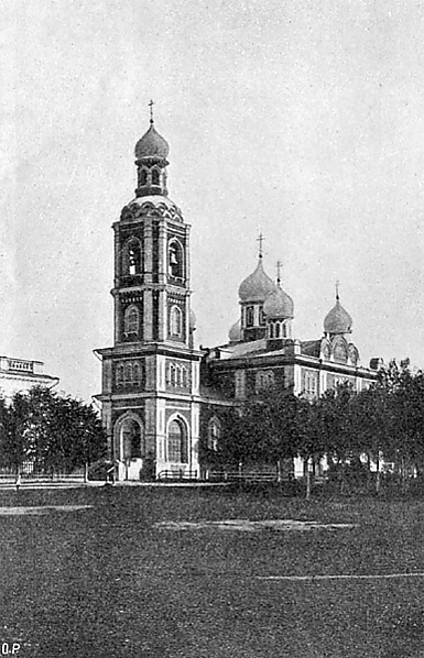 История Храма Всех Святых начинается в 1854 году с прошения общественности о разрешении на строительство храма для главного городского кладбища, на котором в течение семидесяти лет ведутся погребения умерших жителей. В прошении указывается о том, что источником финансирования должны стать пожертвования, начало которым в размере 10 тысяч рублей положил почетный гражданин, купец первой гильдии Николай Максимович Коншин.[1] Указ о разрешении строительства был получен 11 сентября 1858 года. Строительство осуществлялось на месте бывшей часовни[2] в течение 12 лет и завершилось в 1870 году. На создание колокольни средств не хватило. Колокольня возводится по отдельному прошению с 19 июня 1875 по 23 декабря 1875 года.[1]