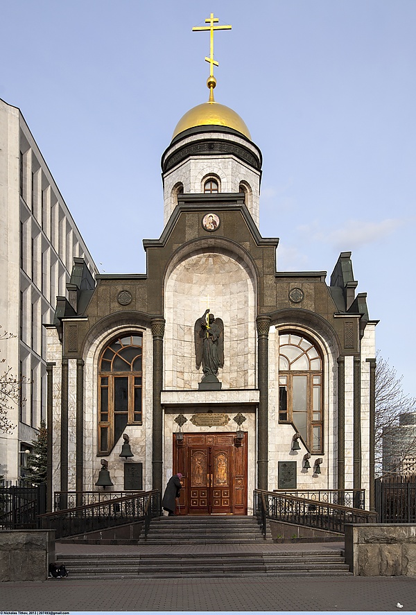 Храм-часовня был построен рядом со зданием МВД в 1999—2000 гг. Авторами проекта стали архитекторы В. Г. Шубина и А. А. Куринный, автор декоративного убранства — скульптор А. А. Бичуков. Храм стал первым капитальным церковным зданием, возведённым в районе Якиманки после более чем восьмидесятилетнего перерыва[2].