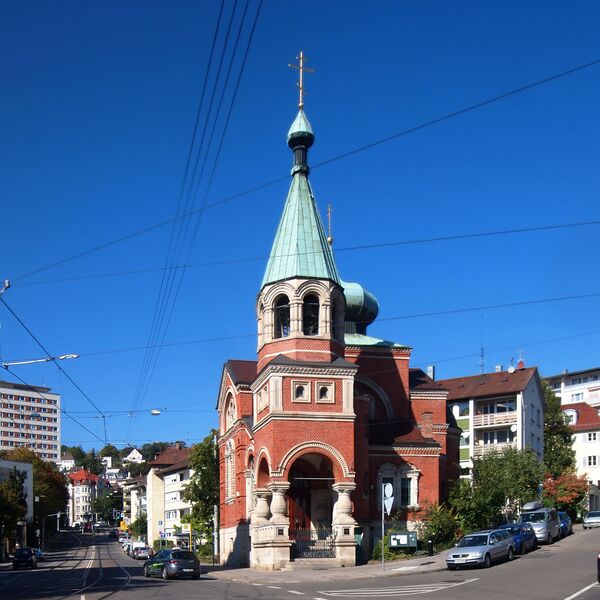 Первый храм в Штутгарте был устроен с прибытием сюда для бракосочетания с королём Вильгельмом I великой княжны Екатерины Павловны. Это была походная церковь, которая была помещена в так называемом Fürstenbau, теперь уже не существующем. Одновременно с будущей королевой прибыл причт. После кончины в 1819 году королевы, эта церковь, вероятно, была перенесена в выстроенный над её могилой особый храм на Ротенберге, где с 1824 по 1889 год постоянно проходили богослужения[1].