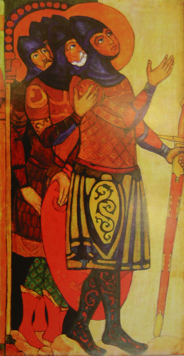 Ко времени начала работы в Талашкине Николай Рерих уже имел опыт создания работ на тему «Спаса Нерукотворного» в техники мозаики. По его эскизу мастерской Владимира Фролова ([89]) была создана мозаика часовни святого Виктора при храме Покрова Пресвятой Богородицы в селе Пархомовка под Киевом в 1906 году (архитектор Владимир Покровский)[90]. «Спас Нерукотворный» в древнерусской символике обозначал победу над смертью (поэтому он украшал стяги русских дружин) и духовное исцеление. Сотник Лонгин, Мария Магдалина, Иоанн Богослов и Богоматерь обычно изображались в древнерусском искусстве в сцене Распятия, Рерих же изобразил их на мозаике Нерукотворного Спаса. Тютюгина считала, что художник при этом не нарушил канон, но создал «собственную вариацию иконописной традиции и собственное прочтение образов»[91]. Нерукотворный лик со святыми воинами был изображён Рерихом и в мозаике, созданной для Троицкого собора Свято-Успенской Почаевской Лавры (1906—1912, украшает южный вход в храм, мастерская Владимира Фролова, архитектор Алексей Щусев)[92].