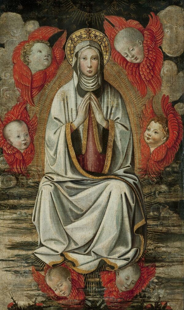 Вокруг Царицы Небесной — города, охраняемые ангелами, святые. Выше — шествие пророков, поклоняющихся кресту[65][Прим 4].