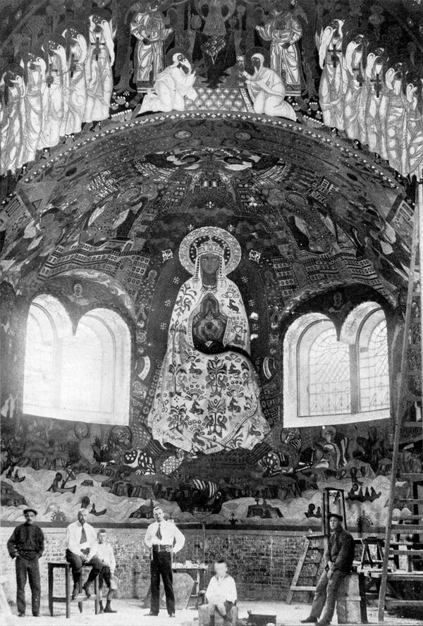 Полякова утверждала, что если от канонов древней живописи отходили современники художника Виктор Васнецов и Михаил Врубель, то Рерих, напротив, возвращался к канонам византийского изобразительного искусства. Рерих изобразил в алтарной композиции строгую Царицу Небесную в традициях именно византийской иконографии. По мнению Поляковой, в отличие от церковных росписей Врубеля, церковь одобряла фрески Рериха[84].