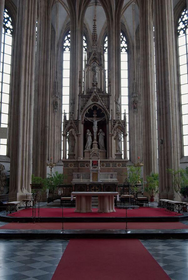 Главный алтарь: неоготический, спроектирован Генрихом фон Ферстелем в 1881 году, строительство осуществлял Иоганн Эдуард Томола (1888—1895). Выполнен алтарь из разноцветного мрамора на котором находятся скульптуры из песчаника (св. Кирилл, св. Мефодий). Размещён главный алтарь в центре пресвитерия.