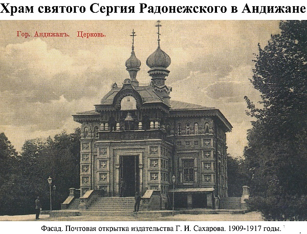- Почтовая открытка. Иванов Ал. А.. На снимке написано: Церковь святого Сергия Радонежского, вид с улицы Горького. Издательство Иванова, Андижан, 1912 год.