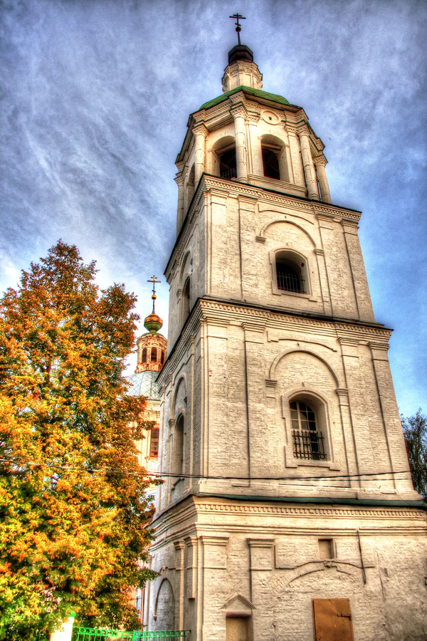 У колокольни — два четверика и восьмерик с приподнятой криволинейной кровлей; в своих формах они успешно развивают архитектурную тему, уже заданную храмом.