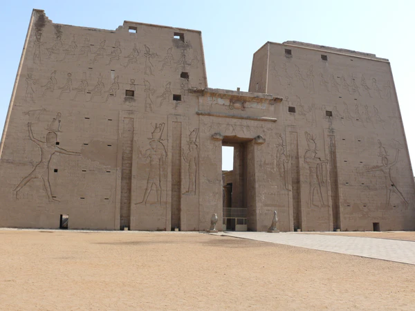 Храм имеет длину 137 и ширину 79 м при высоте пилонов в 36 м[3]. Ось его идет с юга на север, «от Ориона к Большой Медведице». Пилон украшен со всех сторон надписями и изображениями. Птолемей Дионис символически приносит в жертву Хору и Хатхор врагов и молится местным божествам; здесь же за царем и царицей идет процессия представителей разных стран, несущих в храм дары. На верхнюю платформу пилона ведут две лестницы по 242 ступени с 14 площадками.