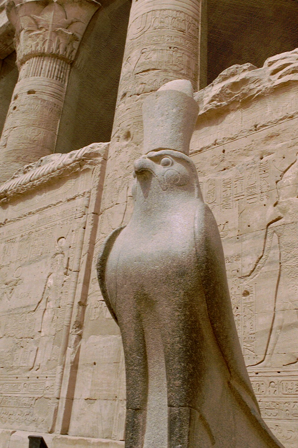 В Эдфу Хора изображали в виде крылатого диска, сокола, иногда человека с головой сокола. В надписях Эдфу он был также Хором-Ра (Ра-Хорахти). Храмовые рельефы подчеркивают тесную связь Хора с его отцом Осирисом, матерью Исидой и супругой Хатхор (Хатор), статуя которой ежегодно привозилась в процессии по Нилу из Дендеры. Строго говоря, Хор представлен на рельефах в трёх лицах, иногда появлявшихся на изображениях одновременно: собственно Хор Бехдетский, Хор-Ра и Хор, сын Осириса и Исиды.