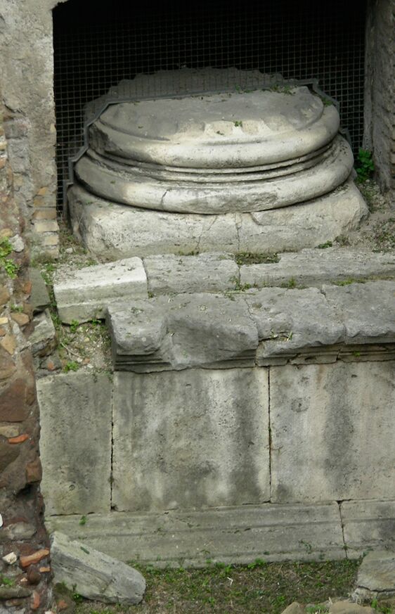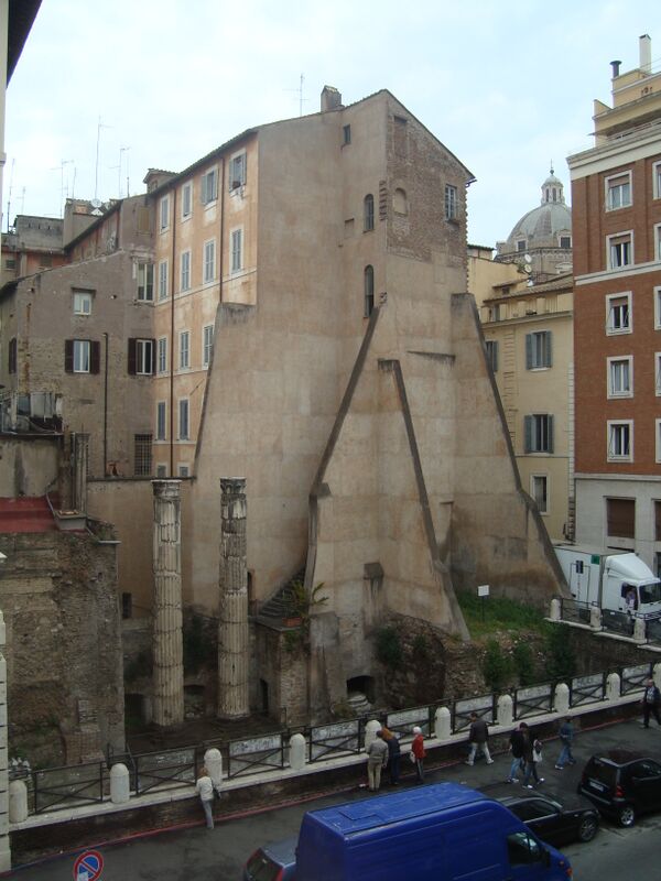 Руины на улице Виа делле Боттеге Оскуре были найдены в 1938 году и оставлены видимыми на стороне современной улицы; две колонны были подняты в 1954 году. Развалины позволяют идентифицировать различные фазы здания: ядро римского бетона внутри подиума восходит ко II веку до нашей эры, база колонн и облом подиума, видимого в данный момент, датируются серединой I века[6]. Архитектурные элементы из мрамора, всё ещё сохранившиеся до наших дней, в том числе фризовая перемычка с жертвенными инструментами[7] эпохи Домициана, возможно, свидетельствуют о реставрации после пожара 80-го года.