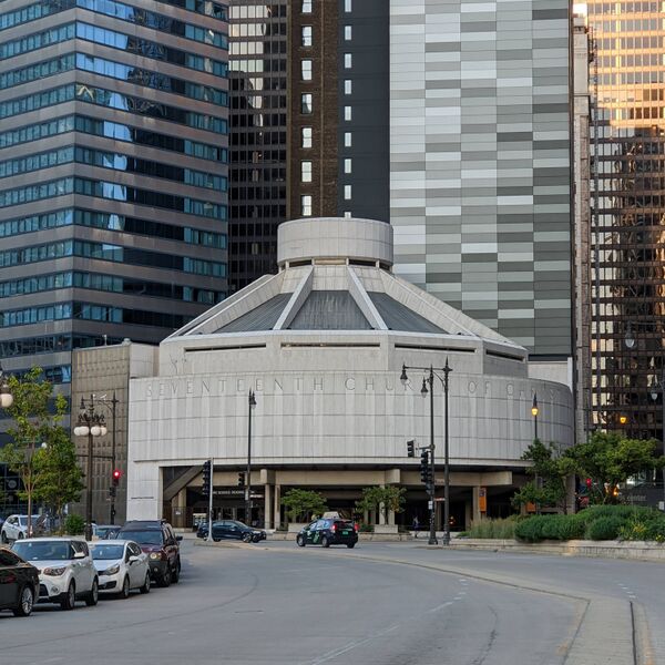 Одна из самых знаковых церквей Христианской науки — Семнадцатая церковь Христа-Учёного в Чикаго, США, памятник архитектуры брутализма.