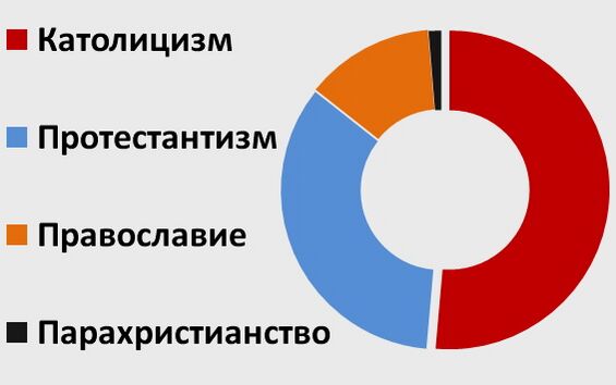Христианство — самая крупная авраамическая и мировая религия[3] как по численности приверженцев, которых около 2,5 млрд, так и по географической распространённости — в каждой стране мира есть хотя бы одна христианская община. Основные направления в христианстве: католицизм — около 1,3 млрд верующих[4]; протестантизм — около 800 млн; православие — около 280 млн; Древневосточные православные церкви (миафизитство) и древневосточная Ассирийская церковь Востока (несторианство) — 70—80 млн[3][5].