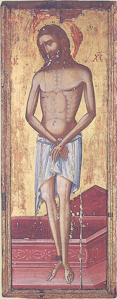 Данная иконография не является изображением какой-либо из Страстей Христовых: поскольку Иисус изображён вертикально стоящим, на фоне креста, — это не Положение во гроб; он не пригвождён к кресту и, значит, это не Распятие Христово; его никто не поддерживает, следовательно, это не Снятие с креста. Кроме того, он не завёрнут в саван, хотя должен был бы. Таким образом, икона имеет символический, а не повествовательный характер.