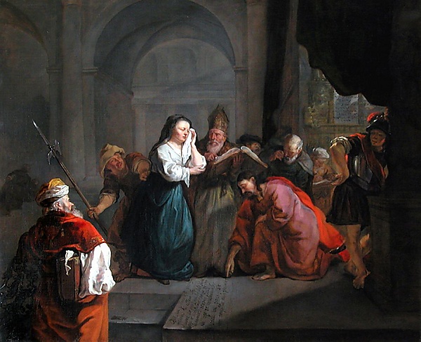 …утром опять пришел в храм, и весь народ шел к Нему. Он сел и учил их. Тут книжники и фарисеи привели к Нему женщину, взятую в прелюбодеянии, и, поставив её посреди, сказали Ему: Учитель! эта женщина взята в прелюбодеянии; а Моисей в законе заповедал нам побивать таких камнями: Ты что скажешь? Говорили же это, искушая Его, чтобы найти что-нибудь к обвинению Его. Но Иисус, наклонившись низко, писал перстом на земле, не обращая на них внимания. Когда же продолжали спрашивать Его, Он, восклонившись, сказал им: кто из вас без греха, первый брось на неё камень. И опять, наклонившись низко, писал на земле. Они же, услышав [то] и будучи обличаемы совестью, стали уходить один за другим, начиная от старших до последних; и остался один Иисус и женщина, стоящая посреди. Иисус, восклонившись и не видя никого, кроме женщины, сказал ей: женщина! где твои обвинители? никто не осудил тебя? Она отвечала: никто, Господи. Иисус сказал ей: и Я не осуждаю тебя; иди и впредь не греши.