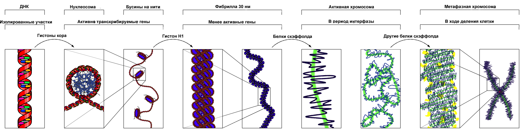 По классическим предствалениям, нить ДНК с нуклеосомами образует нерегулярную соленоид-подобную структуру толщиной около 30 нанометров, так называемую 30-нм фибриллу. В настоящее время, однако, показано, что 30-нм фибрилла является артефактом исследований in vitro, в клетках нуклеосомная фибрилла (у эукариот и некоторых архей) или непосредственно ДНК (у бактерий и некоторых архей) складывается в нерегулярные петлевые и глобулярные структуры, которые в ряде случае имеют регуляторное значение[5]. Дальнейшая упаковка может иметь различную плотность. Если хроматин упакован плотно, его называют конденсированным или гетерохроматином, он хорошо видим под микроскопом. ДНК, находящаяся в гетерохроматине не транскрибируется, обычно это состояние характерно для незначащих или молчащих участков. В интерфазе гетерохроматин обычно располагается по периферии ядра (пристеночный гетерохроматин). Полная конденсация хромосом происходит перед делением клетки.