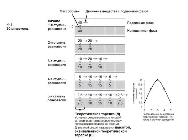 Хроматографию упрощённо можно рассматривать как последовательность непрерывных ступеней уравновешивания, происходящих в ходе процесса разделения. В небольшой секции колонки («тарелке») устанавливается равновесие между количеством вещества в подвижной и неподвижной фазах, которое описывается константой распределения К, характерной для данного типа вещества. Далее та часть вещества, которая находится в подвижной фазе, переносится с её потоком к следующей секции колонки. Здесь также происходит установление равновесия между фазами. На рисунке 2 изображено равновесное распределение вещества с К=1 по пяти последовательным ступеням. Эта модель служит основой так называемой «теории тарелок». Однако следует помнить, что это упрощённое представление, так как оно исходит из того, что на каждой ступени достигается полное равновесие, что в реальности далеко не так из-за непрерывного движения подвижной фазы через колонку. Модель показывает, что распределение вещества по секциям колонки соответствует нормальному распределению и идеальный пик на хроматограмме имеет форму Гауссовой функции[3].
