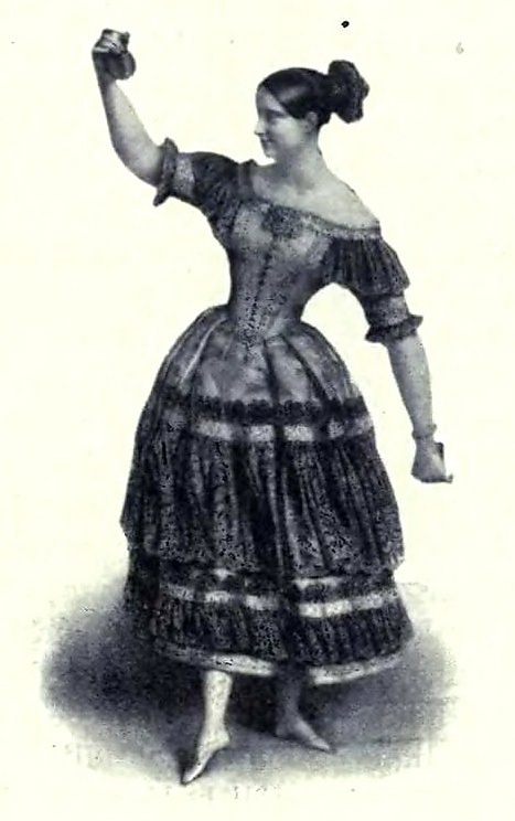 ...Она выходит вперед в баскском национальном костюме из розового атласа, с черными кружевными воланами; расширяющаяся книзу юбка облегает бедра; осиная талия красиво изгибается, а на корсаже сверкает алмазная пряжка; гладкая, как мрамор, ножка просвечивает сквозь тонкую паутинку шелкового чулка, а крошечная ступня готова пуститься в пляс с первыми звуками музыки. Как она очаровательна со своим большим гребнем и розой в волосах, горящими очами и сияющей улыбкой! В розовых её пальцах звенят кастаньеты. Вот она делает первый шаг — раздается звон кастаньет; звук этот — словно гроздья ритма. Как она гибка! как стройна! сколько огня! сколько страсти! сколько пыла! Подняв трепетные руки и склонив голову, она прогибается назад так, что белые плечи её почти касаются пола. Сколько очарования в этом движении! Кажется, будто в эту руку, почти касающуюся полосы рампы, она собирает все желания и весь энтузиазм зала! Мы видели Роситу Диес, Лолу и лучших танцо́вщиц Мадрида, Севильи, Кадикса, Гренады; мы видели альбесинских цыганок; но ничто не может сравниться с этой качучей в исполнении Фанни Эльслер!