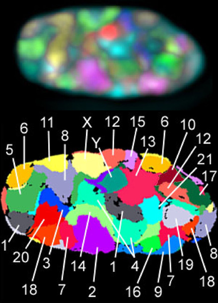 Изображение 46 (23 пар) хромосом женского кариотипа человека, полученное с помощью FISH с флуоресцентно-мечеными Alu-повторами. Alu-повторы показаны зелёным цветом, ДНК — красным. У человека самая длинная 1-я хромосома примерно в 5 раз длиннее самой короткой 21-й хромосомы[33].
