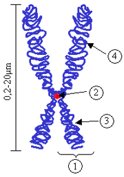 Схема строения хромосомы в метафазе митоза. 1 — хроматида; 2 — центромера; 3 — короткое плечо; 4 — длинное плечо.