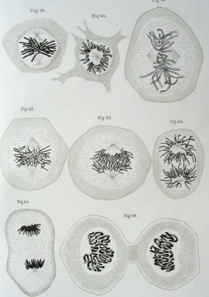 Первые описания хромосом появились в статьях и книгах разных авторов в 70-х годах XIX века, и приоритет открытия хромосом отдают разным людям, а именно: И. Д. Чистякову (1873), А. Шнейдеру (1873), Э. Страсбургеру (1875), О. Бючли (1876) и другим[4]. Чаще всего годом открытия хромосом называют 1882 год, а их первооткрывателем — немецкого анатома В. Флемминга, который в своей фундаментальной книге «Zellsubstanz, Kern und Zelltheilung» собрал и упорядочил сведения о хромосомах, дополнив результатами собственных исследований. Термин «хромосома» был предложен немецким гистологом Г. Вальдейером в 1888 году. «Хромосома» в буквальном переводе означает «окрашенное тело», поскольку оснóвные красители, такие как азуры, основной фуксин, орсеин и др., хорошо связываются хромосомами[5].