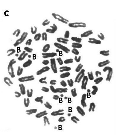 B-хромосомы — это добавочные хромосомы, которые имеются в кариотипе только у отдельных особей в популяции. Они часто встречаются у растений, описаны у грибов, насекомых и животных. Некоторые В-хромосомы содержат гены, часто это гены рРНК, однако не ясно, насколько эти гены функциональны. Наличие В-хромосом может влиять на биологические характеристики организмов, особенно у растений, где их наличие ассоциируется с пониженной жизнеспособностью. Предполагается, что В-хромосомы постепенно утрачиваются в соматических клетках в результате нерегулярности их наследования[28].