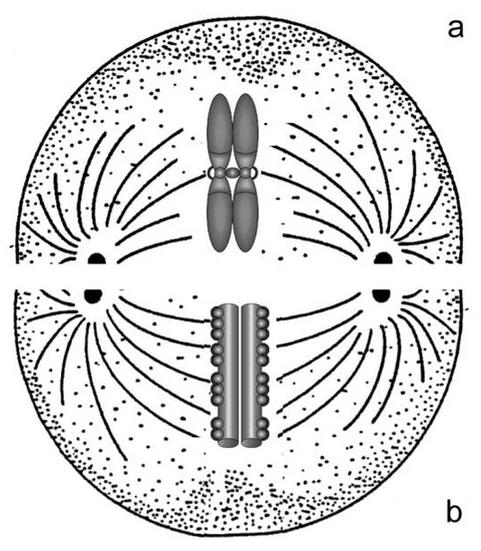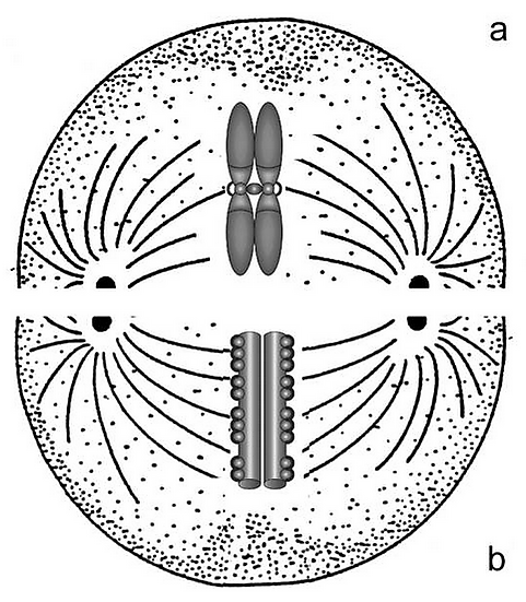На стадии метафазы митоза хромосомы состоят из двух продольных копий, которые называются сестринскими хроматидами и которые образуются при репликации. У метафазных хромосом сестринские хроматиды соединены в районе первичной перетяжки, называемой центромерой. Центромера отвечает за расхождение сестринских хроматид в дочерние клетки при делении. На центромере происходит сборка кинетохора — сложной белковой структуры, определяющей прикрепление хромосомы к микротрубочкам веретена деления — движителям хромосомы в митозе[13]. Центромера делит хромосомы на две части, называемые плечами. У большинства видов короткое плечо хромосомы обозначают буквой p, длинное плечо — буквой q. Длина хромосомы и положение центромеры являются основными морфологическими признаками метафазных хромосом.