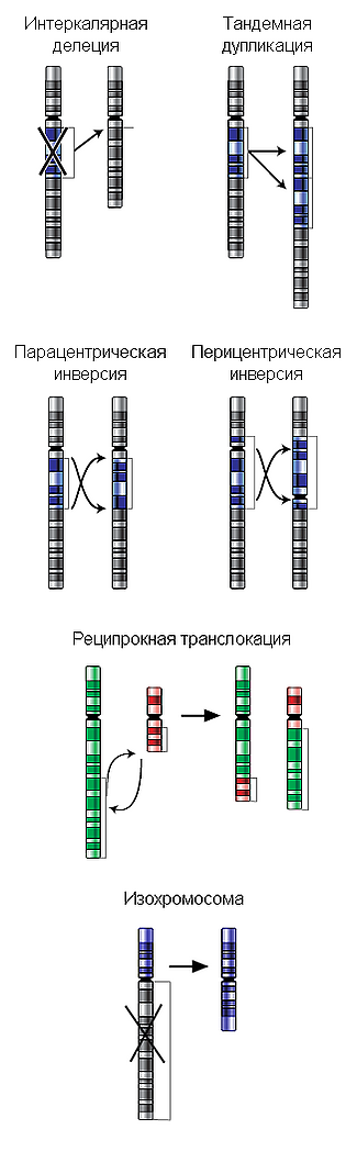 Хромосомные перестройки (хромосомные мутации, или хромосомные аберрации) — тип мутаций, которые изменяют структуру хромосом. Классифицируют следующие виды хромосомных перестроек: делеции (утрата участка хромосомы), инверсии (изменение порядка генов участка хромосомы на обратный), дупликации (повторение участка хромосомы), транслокации (перенос участка хромосомы на другую), а также дицентрические и кольцевые хромосомы. Известны также изохромосомы, несущие два одинаковых плеча. Если перестройка изменяет структуру одной хромосомы, то такую перестройку называют внутрихромосомной (инверсии, делеции, дупликации, кольцевые хромосомы), если же двух разных, то межхромосомной (дупликации, транслокации, дицентрические хромосомы). Хромосомные перестройки подразделяют также на сбалансированные и несбалансированные. Сбалансированные перестройки (инверсии, реципрокные транслокации) не приводят к потере или добавлению генетического материала при формировании, поэтому их носители, как правило, фенотипически нормальны. Несбалансированные перестройки (делеции и дупликации) меняют дозовое соотношение генов, и, как правило, их носительство сопряжено с существенными отклонениями от нормы.