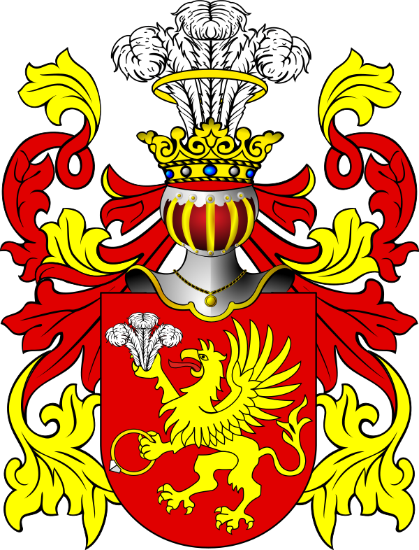 В навершии шлема такие же перья в золотом кольце. Герб Гриф 3 (употребляют: Хроневские) внесен в Часть 2 Гербовника дворянских родов Царства Польского, стр. 88.