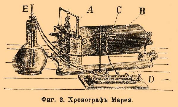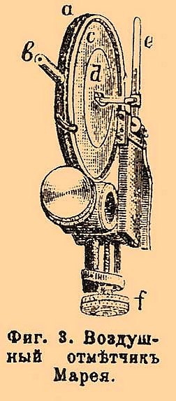 В каждом из этих положений ось барабана служит продолжением соответствующей оси часового механизма и с ней сцепляется и вращается, например на одной оси — раз в минуту, на другой — 6 раз, на третьей 36 раз в минуту. На барабан В наклеивают гладкую бумагу, которую покрывают лёгким слоем копоти, например от свечи. Запись на копоти самым деликатным отметчикам представляет весьма малое сопротивление и легко может быть закреплена спиртовым раствором шеллака. Отметчик устанавливается на горизонтальном стержне С, укреплённом на неподвижной стойке. Наиболее употребительны быстрые отметчики: воздушный — Марея и электромагнитный — Марсель Депре. Отметчик Марея состоит из металлического сосуда а, передняя стенка которого затянута тонкой каучуковой перепонкой с; на эту перепонку наклеен лёгкий алюминиевый кружок d.