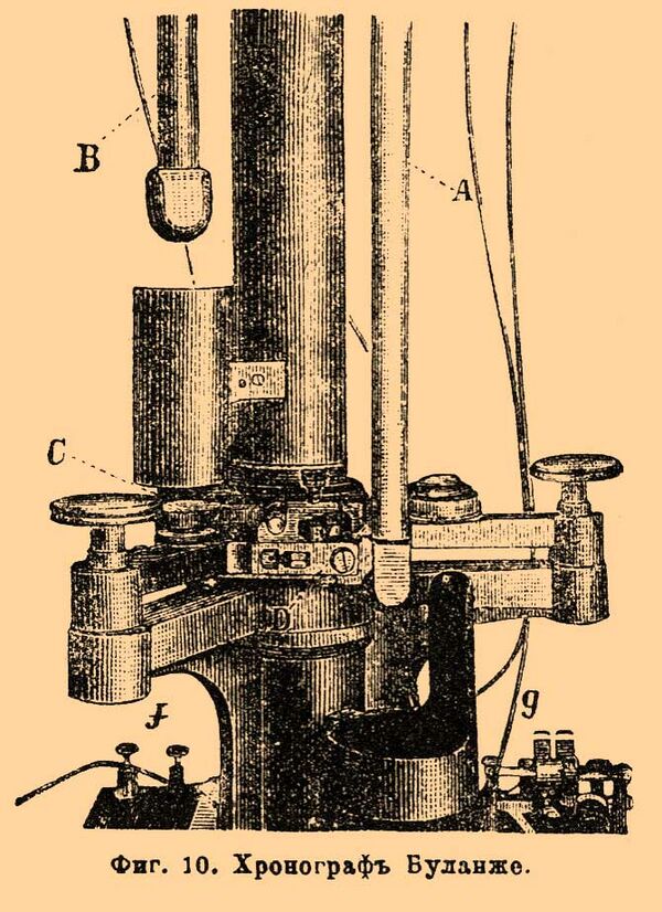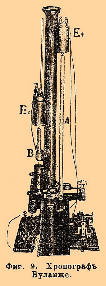 Он состоит из часового механизма, приводимого в движение гирями, снабжён регулятором в роде Фуко; регулировку можно несколько менять, увеличивая расхождение лопастей регулятора, что достигается поворотом головки Е. Часовой механизм даёт очень быстрое вращение валику А (до 100 оборотов в секунду) и через каждые 100 оборотов валика А даёт сигнал звонком В для определения по секундомеру скорости вращения валика во время наблюдений. Перед валиком, нормально к нему, установлен изолированный от механизма штифт D. Произведя разряд между D и В, получим отметку на барабане А. Угловое расстояние между двумя отметками может быть измерено при помощи микроскопа С и микрометренного винта, вращающего барабан. У описанного прибора валик А не имеет винтового хода, поэтому прибор пригоден для явлений, длительность которых менее, чем время полуоборота валика. Подобными приборами пользовались прежде для определения начальных скоростей огнестрельных снарядов, причём искра получалась на приборе от разряда вторичной обмотки спирали Румкорфа при размыкании тока первичной цепи самим снарядом. Очевидно, что на подобном приборе можно записать несколько последовательных, весьма быстро следующих один за другим однородных явлений, если для каждой отметки будем брать особую спираль Румкорфа. Кроме описанных хронографов, бывают ещё хронографы не столь универсальные, а приспособленные для какой-нибудь определённой задачи, к таким приборам принадлежит хронограф Буланже, употребляемый всюду для определения начальных скоростей снарядов и ружейных пуль. При помощи этого хронографа можно легко сделать весьма много наблюдений в самое короткое время и притом сразу отчитывать окончательные результаты. Этот прибор устроен следующим образом: на вертикальной колонне укреплены два электромагнита Е1 и Е2 с прямыми сердечниками, заострёнными снизу.