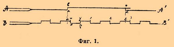 Для этого проведём из а и d перпендикуляры ak и dl; очевидно, что искомая продолжительность явления больше 2 секунд, но менее 4 и близка к 3 сек. Если длины, изображающие секунды по смежности с k и l, близки между собой, то искомый промежуток времени определим точнее; если средняя длина секунды около k получилась, например, 15 мм, а расстояние между точками k и о равно 3 мм, то должно прибавить к двум секундам 3/15 сек., или 0,2 сек. Подобным же образом найдём, что время, соответствующее длине 2 l, будет 0,75 сек. Искомая продолжительность ad равна = 2 + 0,2 + 0,75 = 2,95 сек. Основанный на таком принципе хронограф является самым совершенным и должен состоять, следовательно, из следующих частей: