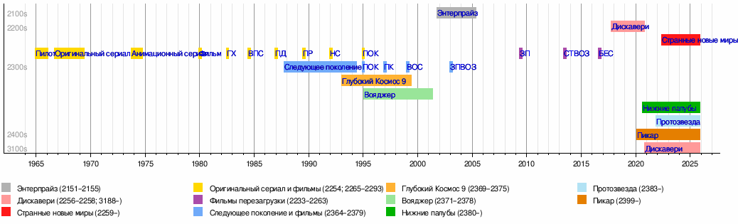 | Год | Звёздная дата | «Энтерпрайз», «Странные новые миры», «Оригинальный сериал», «Следующее поколение», «Пикар», фильмы оригинальной хронологии, основные события | Мультсериалы | Романы и комиксы | «Глубокий космос 9» | «Вояджер» | «Дискавери» | Перезагрузка фильмов (временная шкала Кельвина) | Видеоигры |