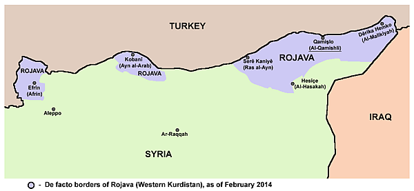 - зону контроля «Сирийских демократических сил» (СДС) в преимущественно курдских районах северных провинций (самопровозглашённая Демократическая Федерация Северной Сирии);