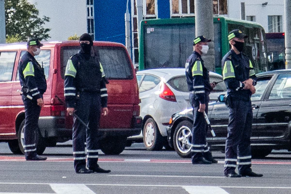 Днём на въездах в Минск были замечены десятки автомобилей внутренних войск и Министерства обороны. Вечером в центре начали собираться протестующие[100]. Правоохранительные службы перекрыли центр города, разгоняли и задерживали протестующих[101], также были закрыты станции метрополитена «Пушкинская» и «Спортивная». В некоторых местах протестующие пытались противодействовать ОМОНу и внутренним войскам. ОМОН призывал людей не поддаваться на провокации и разойтись. Люди в ответ скандировали «Жыве Беларусь!» (с белор. — «Да здравствует Белоруссия!»). Протестующие перекрыли для автодвижения многие улицы в центре Минска, пропуская только машины «скорой»; позже ОМОН начал использовать для передвижения машины «скорой помощи»[102].