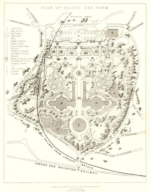 Парк, спроектированный Эдвардом Миллнером, включал двойной каскад прудов и «естественное» озеро с островами — всего 15 водоёмов. В фонтанах было задействовано до 12 000 струй высотой до 76 м, расходовавших до 7 миллионов галлонов воды на каждое представление[8]. Напор обеспечивали две водонапорные башни по проекту Брюнеля (первые башни по проекту Пакстона рухнули под тяжестью воды до открытия парка). Эксплуатация фонтанов оказалась чрезмерно дорогой, они были вскоре заброшены — в 1894 году два пруда были засыпаны, на месте третьего в 1895 году выстроен футбольный стадион. Восстановление дворца и парка обошлось в 1 300 000 фунтов — на 800 000 дороже сметы.